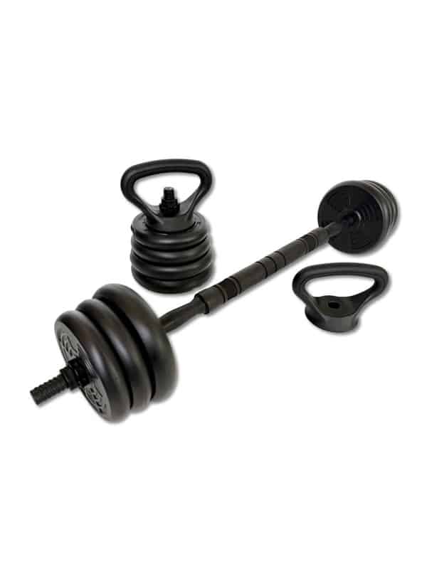 – 3-i-1: Håndvægte, vægtstang & kettlebell i ét sæt- Justerbar 20 kg med flere vægtskiver- Med forbindelsesstang til lang vægtstang- Kettlebell-håndtag & push-up bars inkluderet- Kompakt alt-i-én løsning til hjemmetræningGør hjemmetræningen mere e